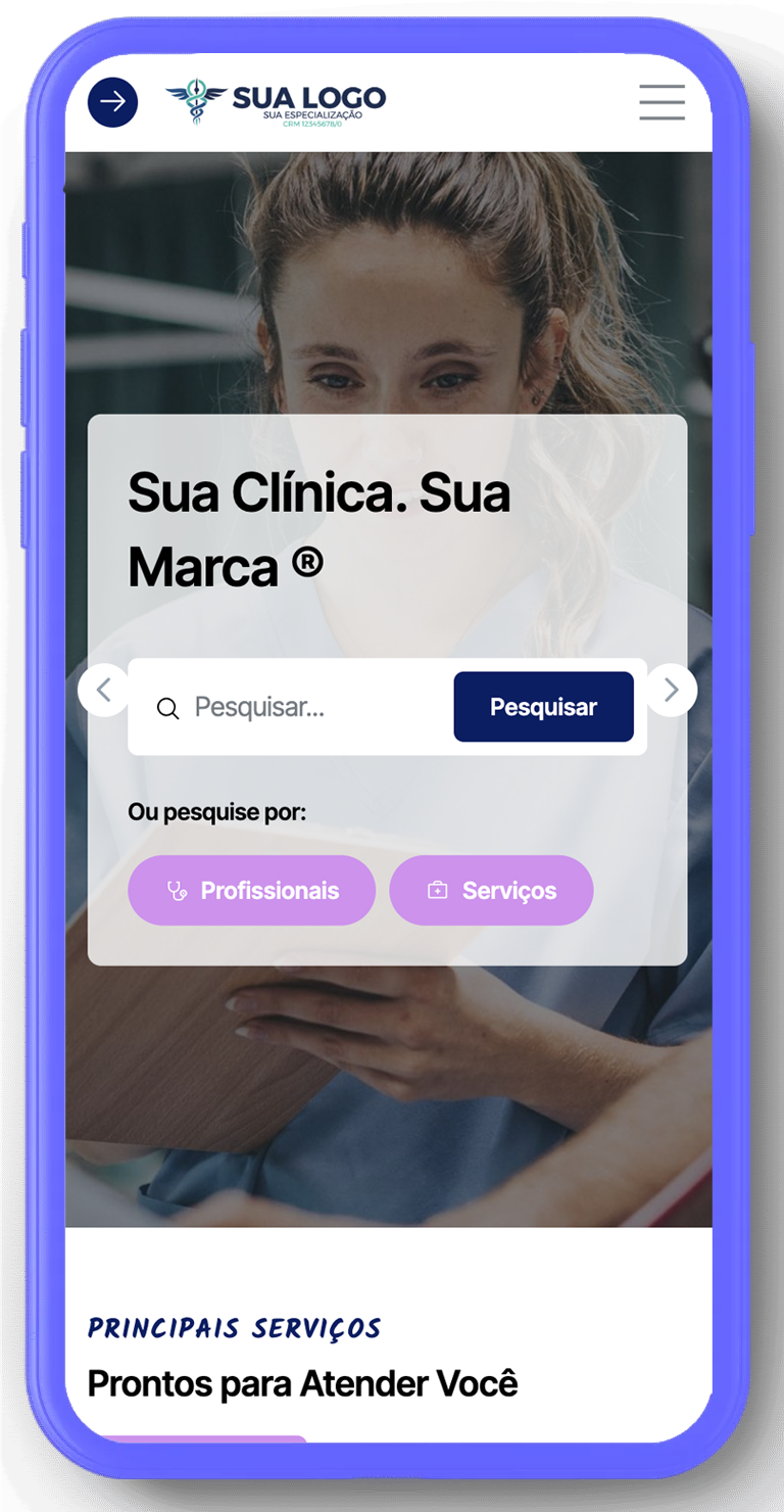 Seu sistema rodando em nuvem dedicada, com app exclusivo publicado nas lojas Google e Apple com nome e logo da sua clínica.